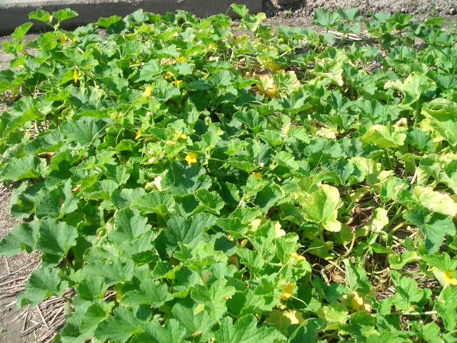 | 5月27日 | 風除けを外し、敷き藁をする 手前から すいか、かぼちゃ、まくわうり |