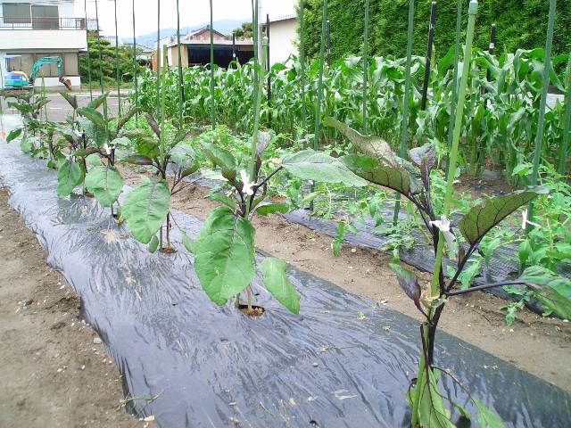 | 7月27日 今植えてある株を選定しても、秋ナスは望めないと判断し、 新しい苗を5株購入し、定植した。 |