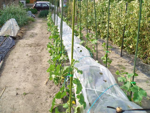 | 5月14日 | トンネルの片側をあけ、孫ツルを切りとる。 株穴ごとに1800の支柱を立て、苗の先端をくくりつける アブラムシの発生がみられたので、株元にオルトラン粒剤を撒いておく |