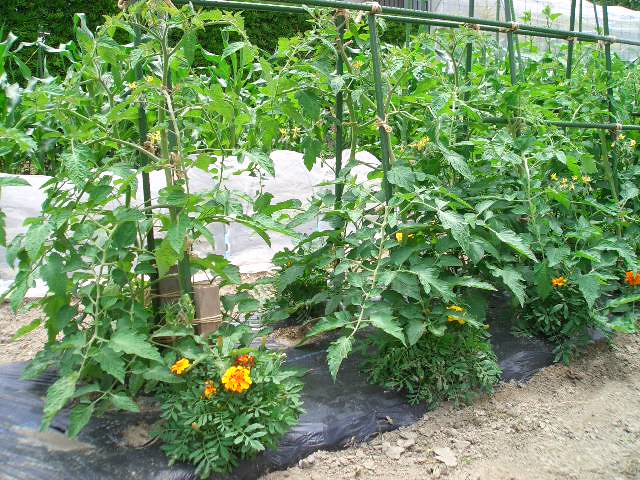 | 6月20日 | 畑の様子 手前の花は、マリーゴールド:コンパニオンプランツとして植えています |