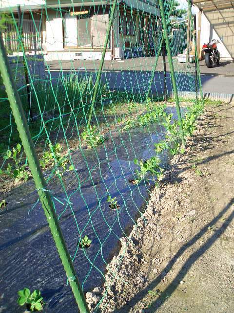 | 10月7日 | 70cm×2Mの畝 苦土石灰を全面に撒く。 畝の中央に25cm位の深さの溝を掘り、牛糞堆肥5L、ファイト(魚粕入り有機配合オール10)200cc、骨粉入り配合200ccを混ぜたものを投入。 ミシン目入りマルチを敷く 支柱&ネット設置 前作のキュウリ用を片付け、スナックエンドウ用に仕上げるのに3時間程費やしてしまいました。 |